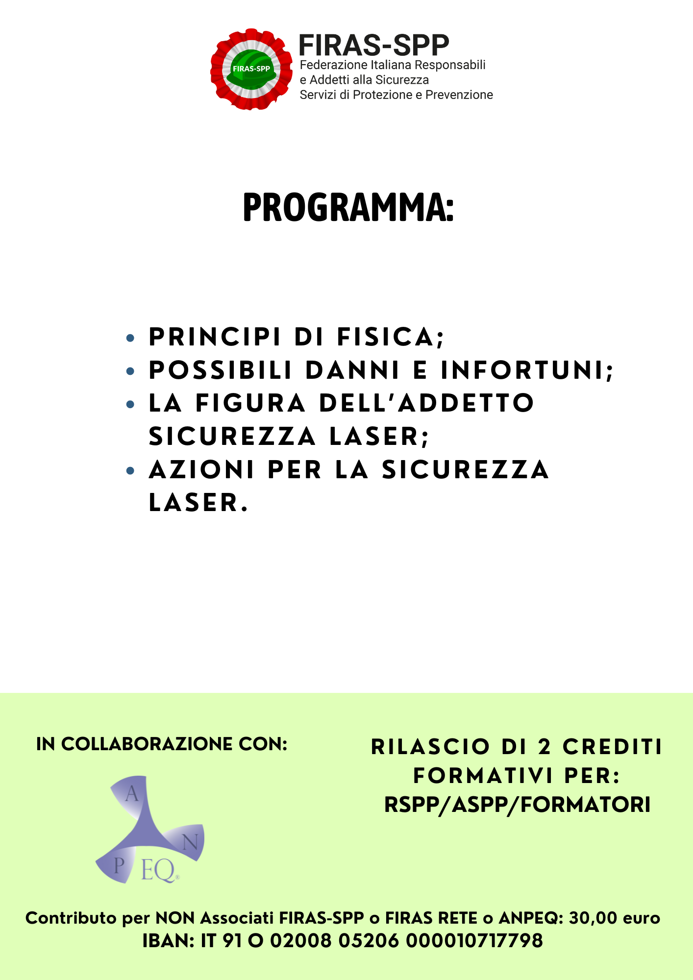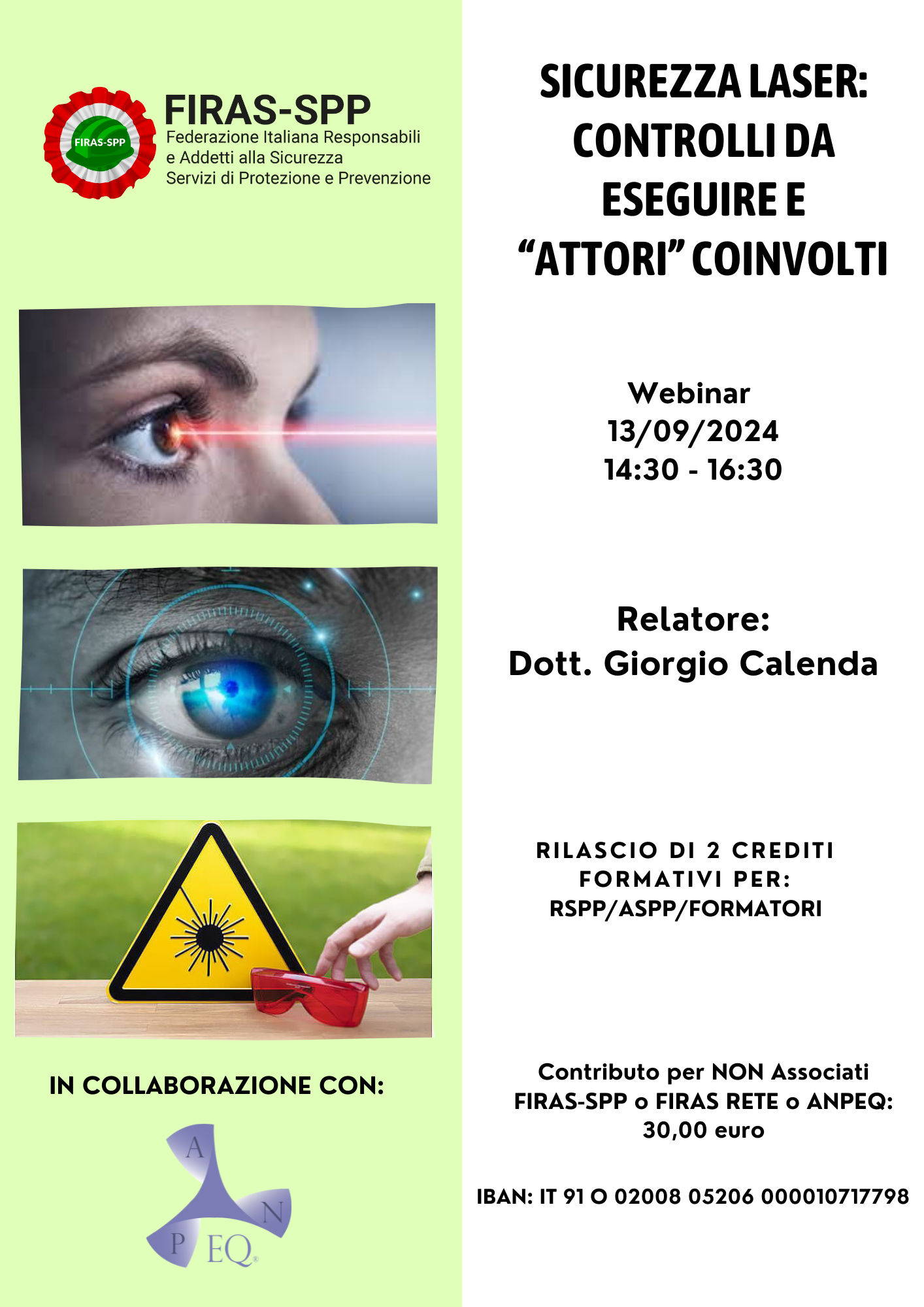 Si trasmette il programma e la locandina del prossimo webinar FIRAS in collaborazione con ANPEQ dal tema “Sicurezza Laser: controlli da eseguire e “attori” coinvolti” che si terrà il giorno 13 settembre 2024 dalle 14.30 alle 16.30.